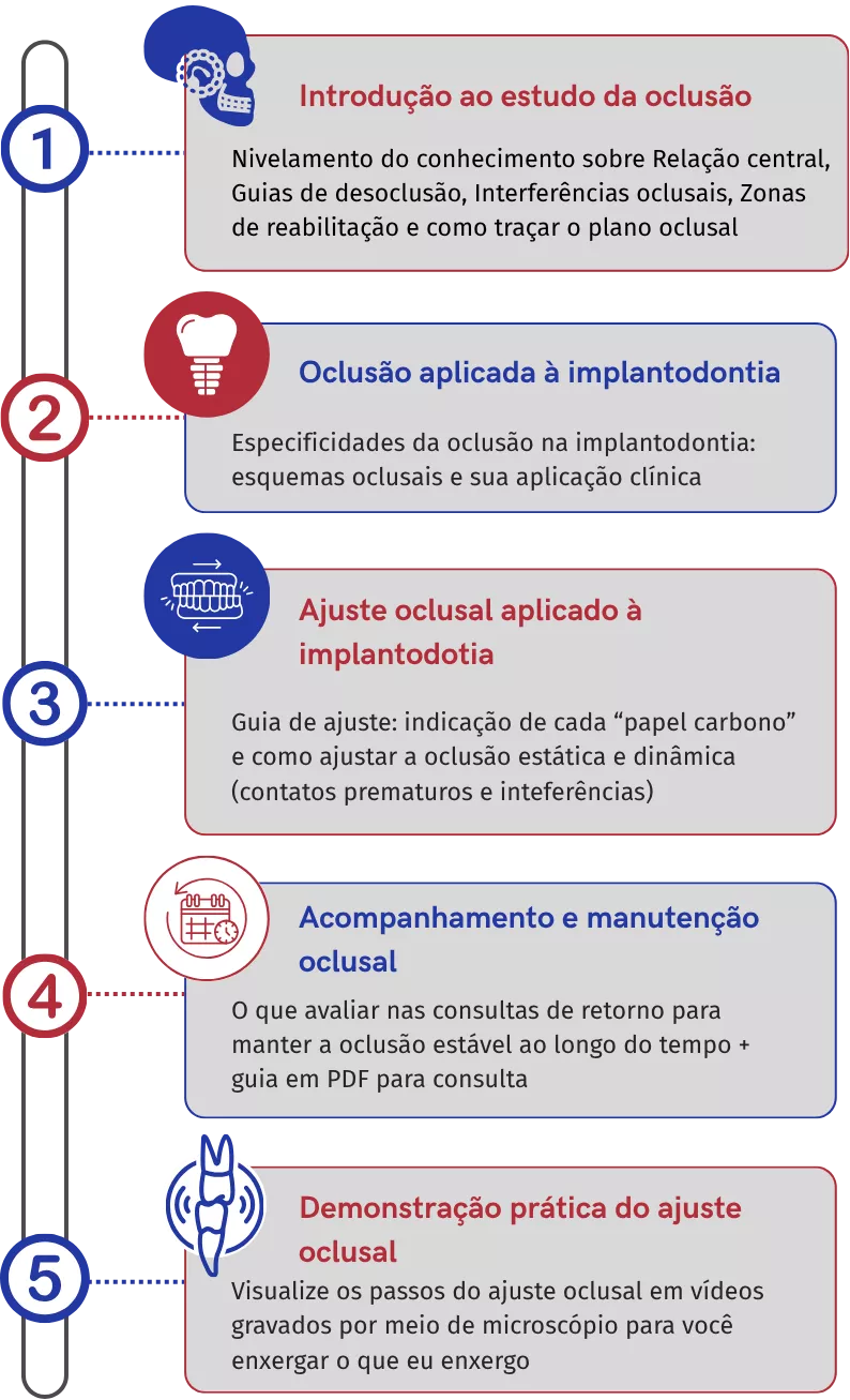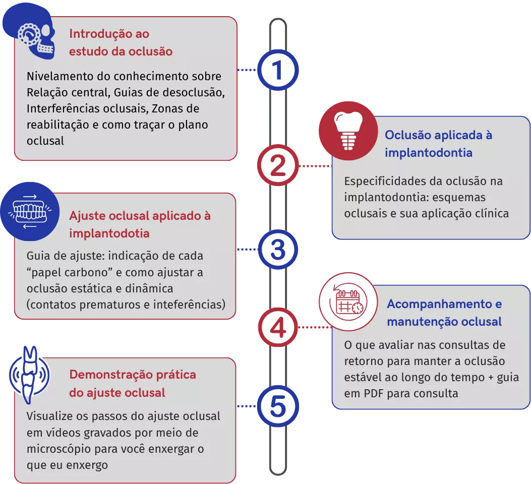 O curso ensina os fundamentos da oclusão de maneira geral (aplicável para dente natural) e foca nas especificidades voltadas para a implantodontia, incluindo caso de carga imediata.